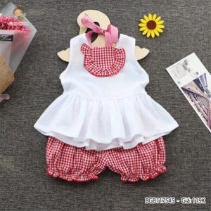 Set áo linen bèo túi trước quần bí caro dễ thương cho bé gái